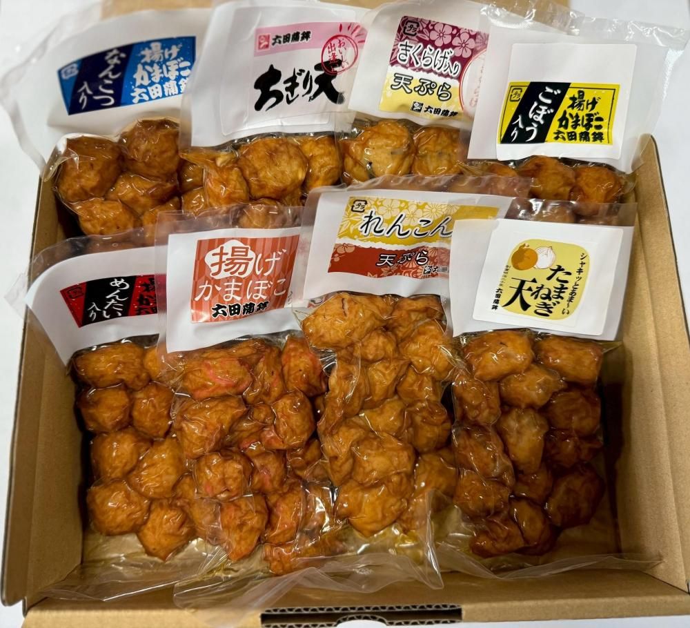 魅力溢れる六田蒲鉾のちぎり天セット!個包装された8種類×10セットのバラエティ豊かなセットで、一つの箱にまとめられています。なんこつ天、チーズちぎり天、ごぼうちぎり天、明太子天、キクラゲちぎり天、レンコンちぎり天、紅しょうが天、たまねぎ天と、どれも美味しさ満点のラインナップです。
